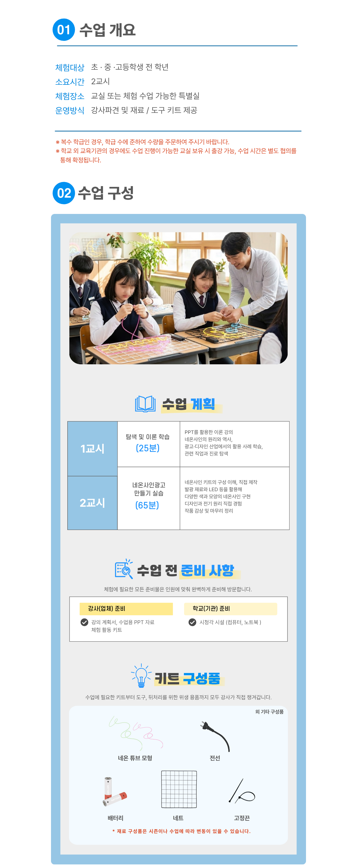 유의사항 한 과목당 최소 20명 이상 (한 반 인원이 20명 미만일 경우 추가 체험비 발생, 20명 이상일 경우 변동 없음)