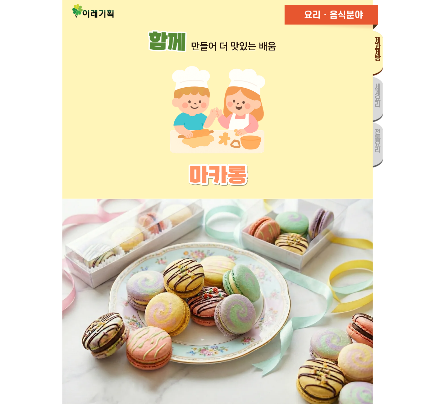 | 수업목표 | 파티시에에 대해 알아보고 여러가지 데코 재료를 이용하여 나만의 마카롱 만들기 |