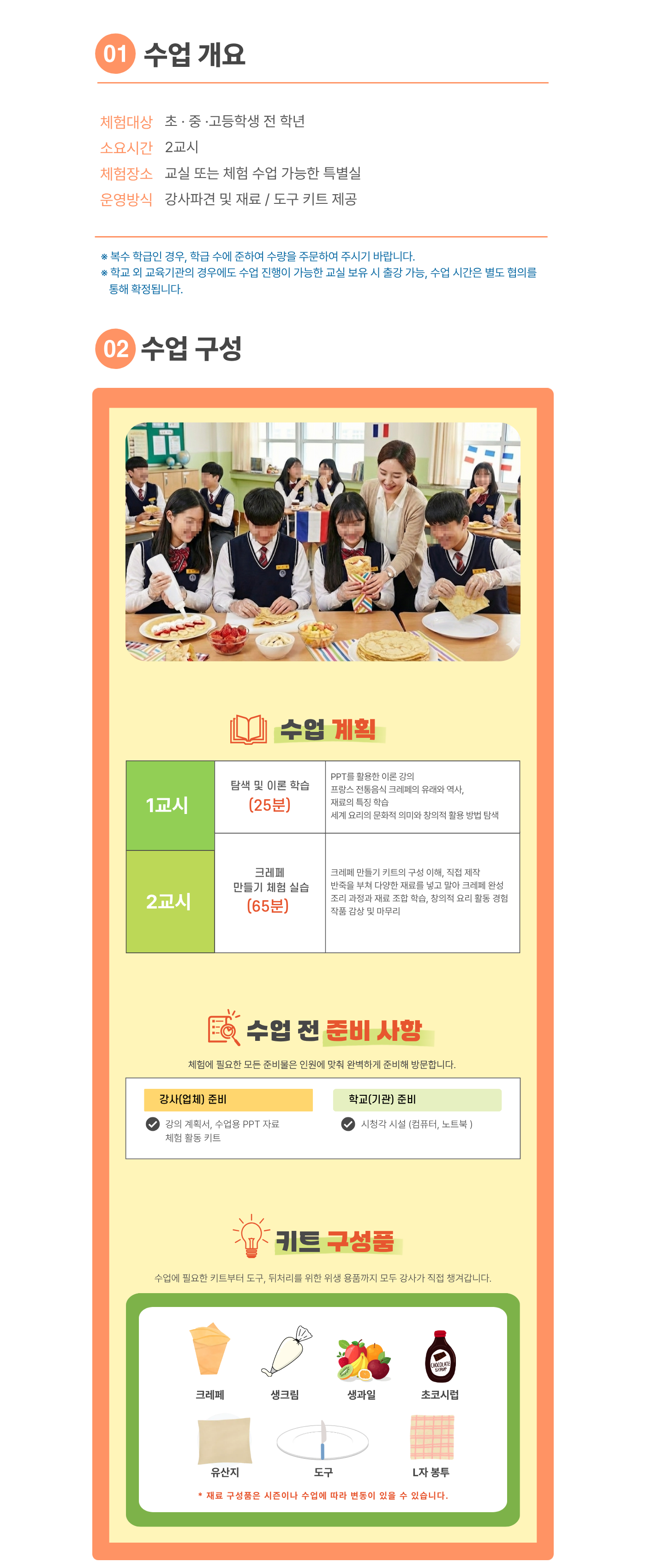 | 수업목표 | 각 나라별 대표음식에는 무엇이 있는지, 프랑스 대표 음식인 크레페의 유래와 역사에 대해 알아보고 제철 과일을 이용하여 나만의 크레페 만들기 |