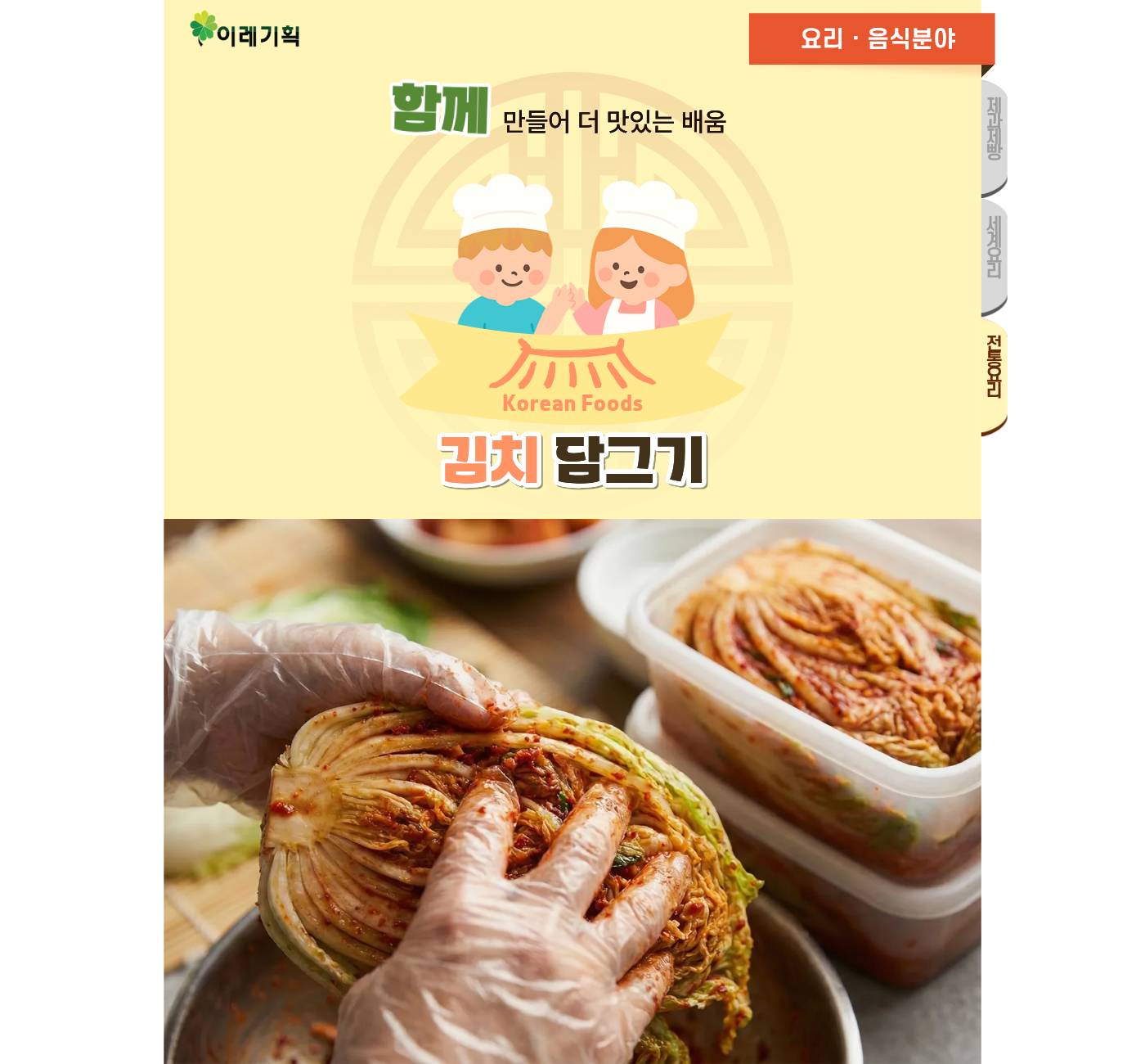 | 수업목표 | 우리 나라 전통음식과 김치의 유래와 역사에 대해 이해하고 직접 김치 담그기 |