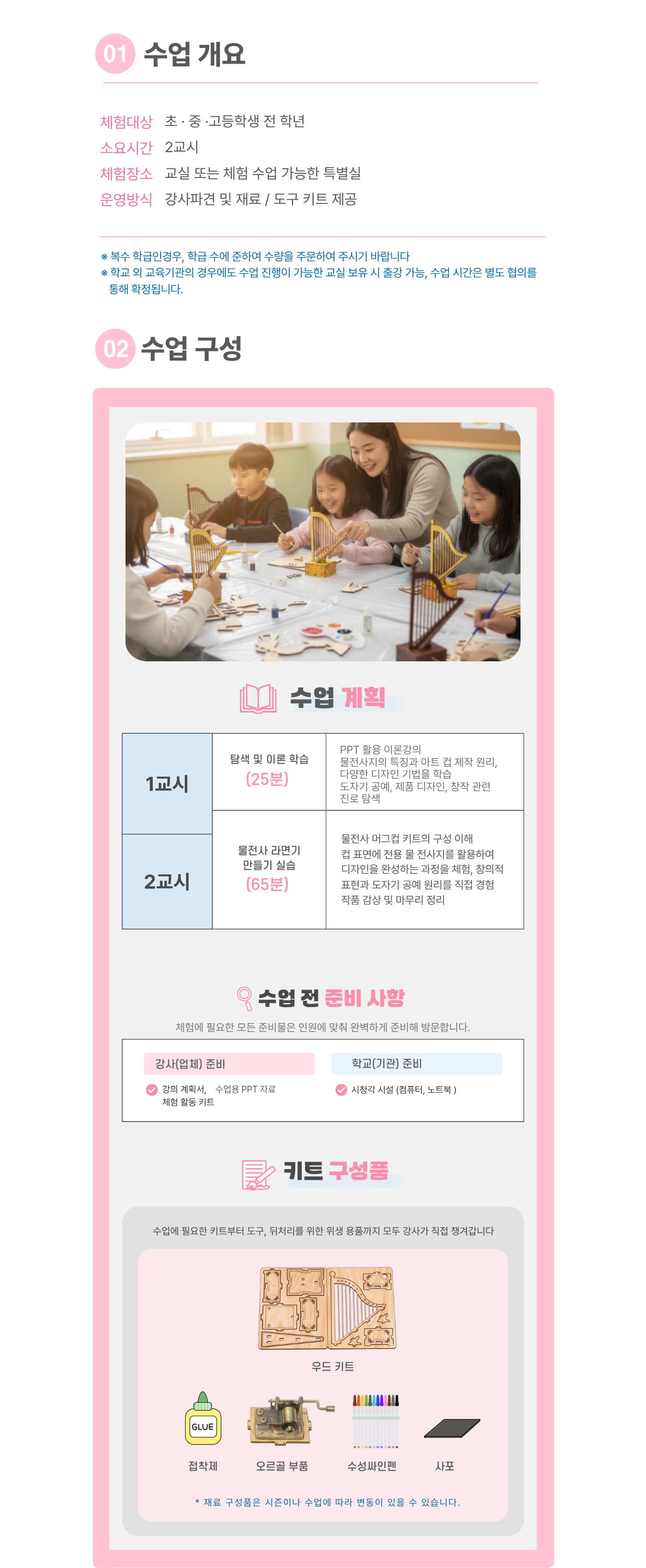 | 인원기준 | 1과목당 최소 21명 이상 (1반 인원이 21명 미만일 경우 추가 체험비 발생, 21명 이상일 시 변동없음) |