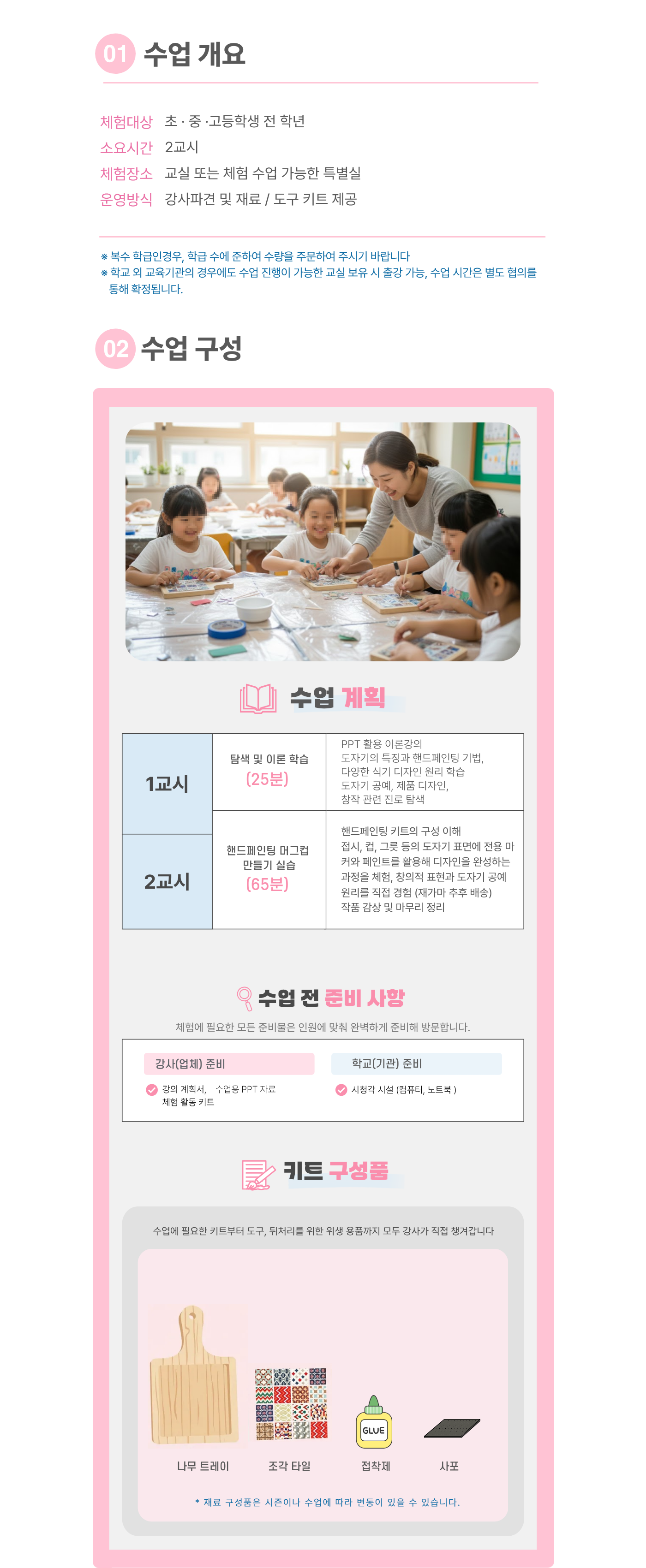 | 인원기준 | 1과목당 최소 21명 이상 (1반 인원이 21명 미만일 경우 추가 체험비 발생, 21명 이상일 시 변동없음) |