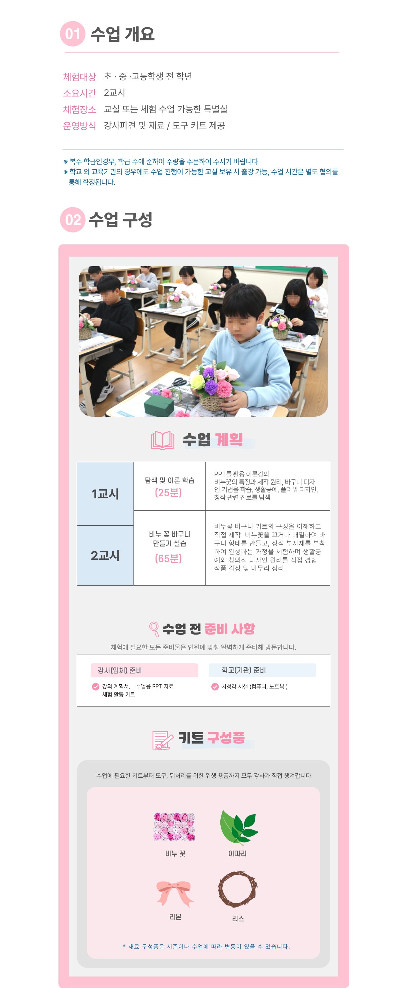 | 인원기준 | 1과목당 최소 21명 이상 (1반 인원이 21명 미만일 경우 추가 체험비 발생, 21명 이상일 시 변동없음) |