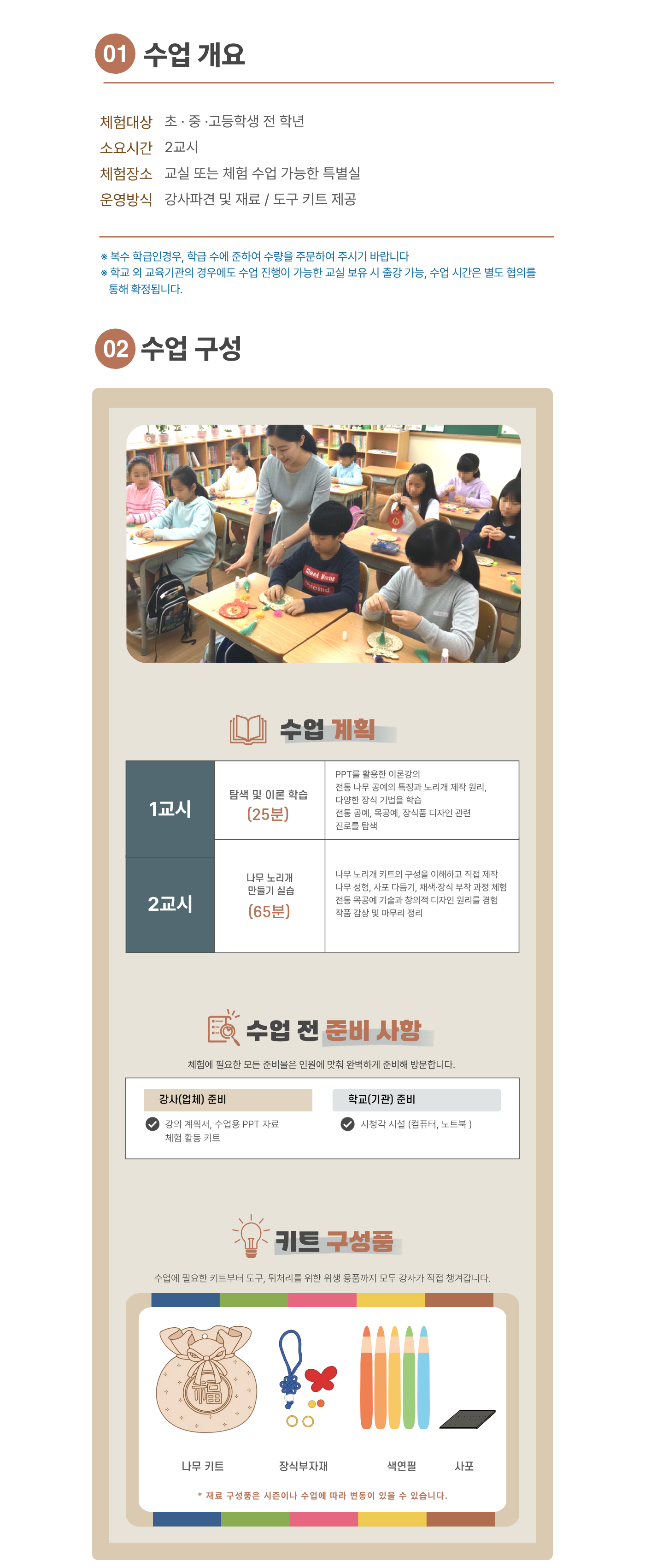 | 수업목표 | 전통 목공예를 이해하고 나무 노리개 만들기 |
