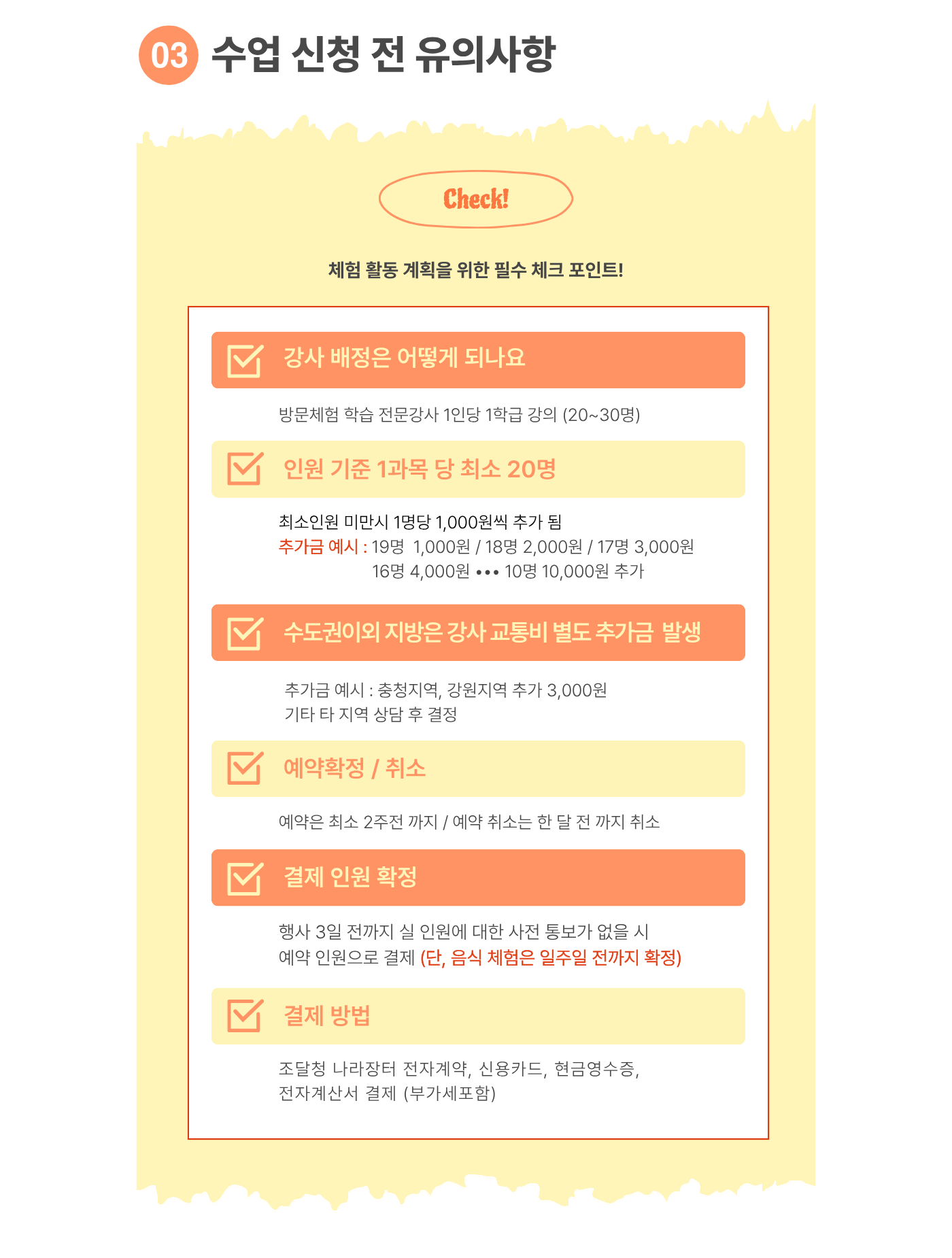 한 과목당 최소 20명 이상 (한 반 인원이 20명 미만일 경우 추가 체험비 발생, 20명 이상일 경우 변동 없음)