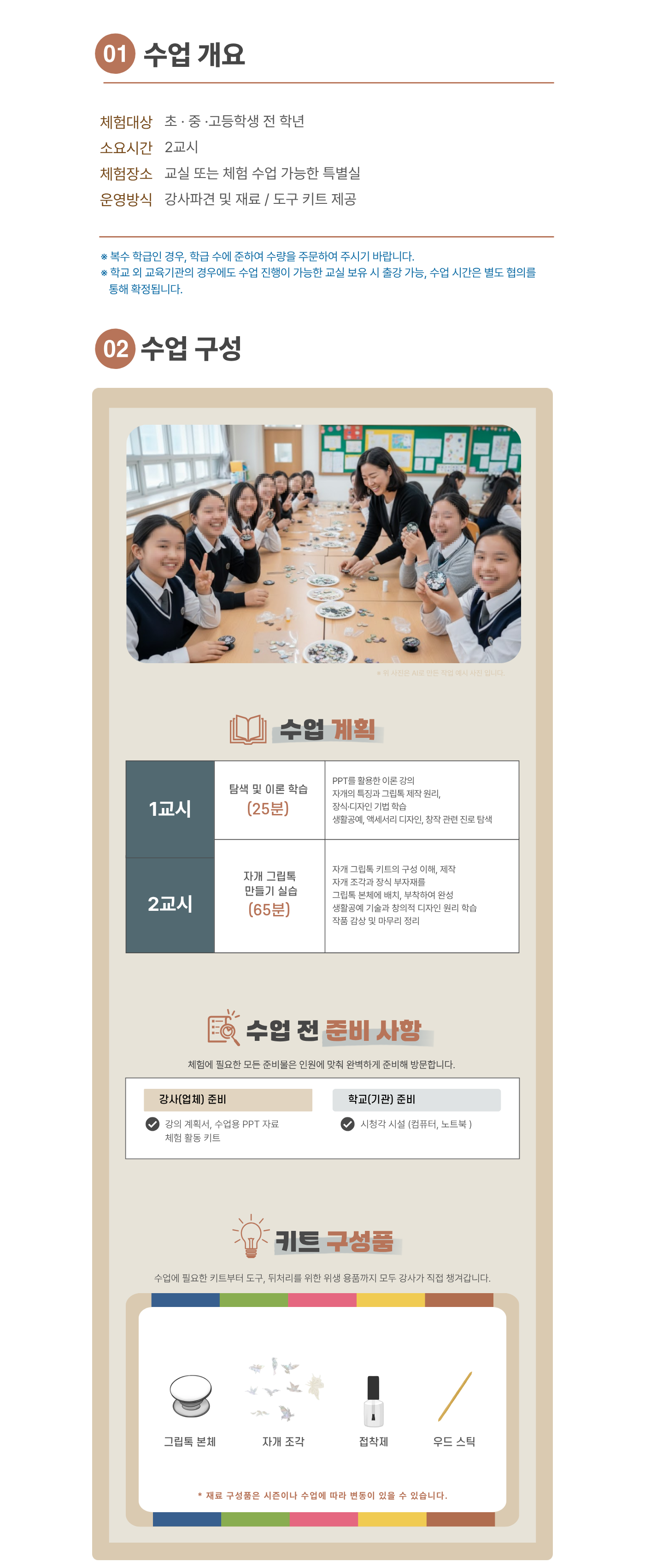 | 유의사항 | 한 과목당 최소 20명 이상 (한 반 인원이 20명 미만일 경우 추가 체험비 발생, 20명 이상일 경우 변동 없음) |