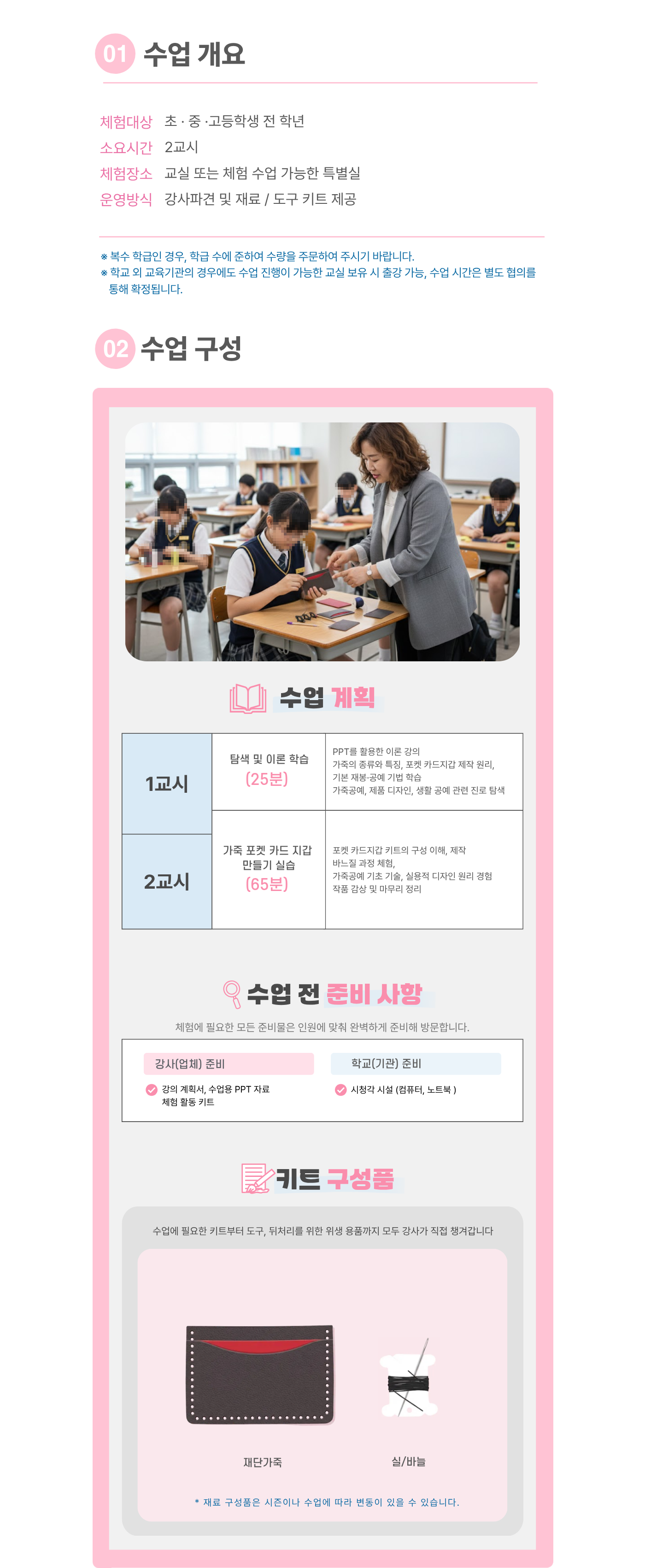 유의사항 한 과목당 최소 20명 이상 (한 반 인원이 20명 미만일 경우 추가 체험비 발생, 20명 이상일 경우 변동 없음)