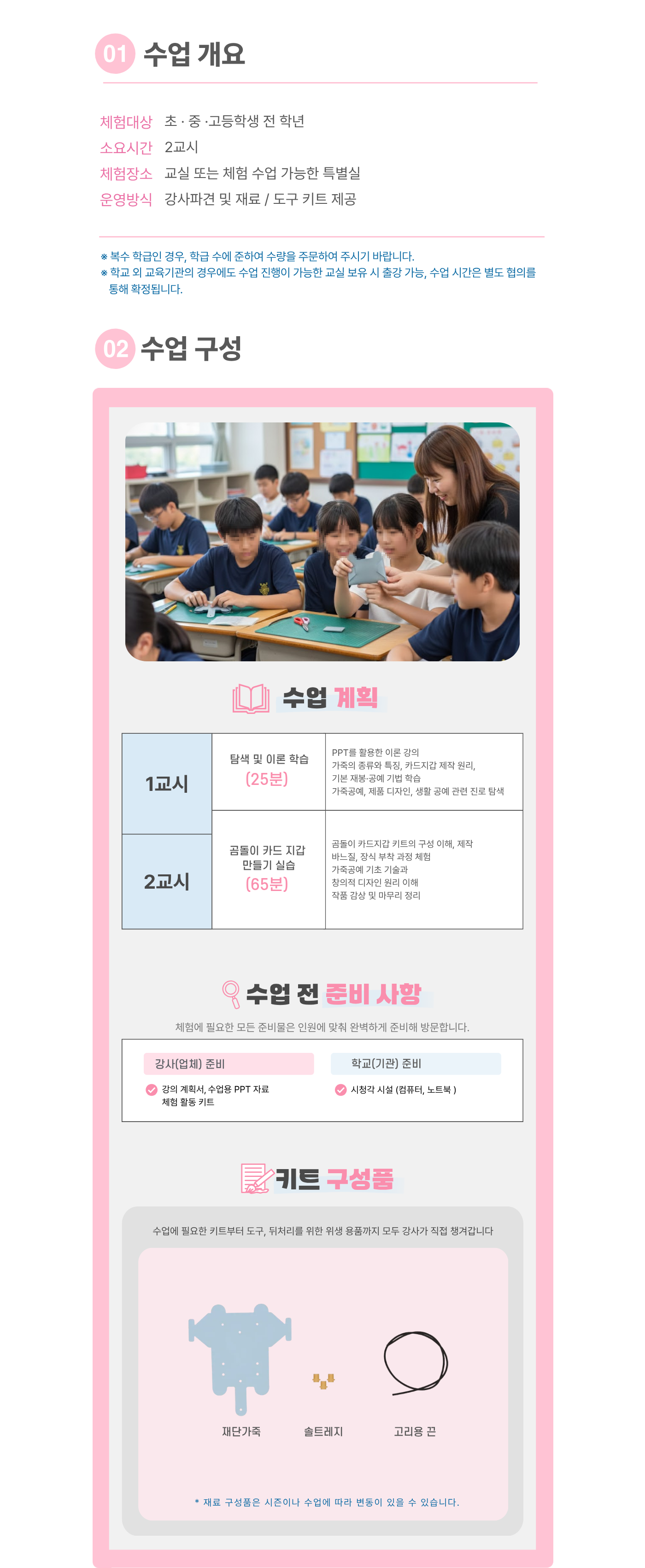 유의사항 한 과목당 최소 20명 이상 (한 반 인원이 20명 미만일 경우 추가 체험비 발생, 20명 이상일 경우 변동 없음)