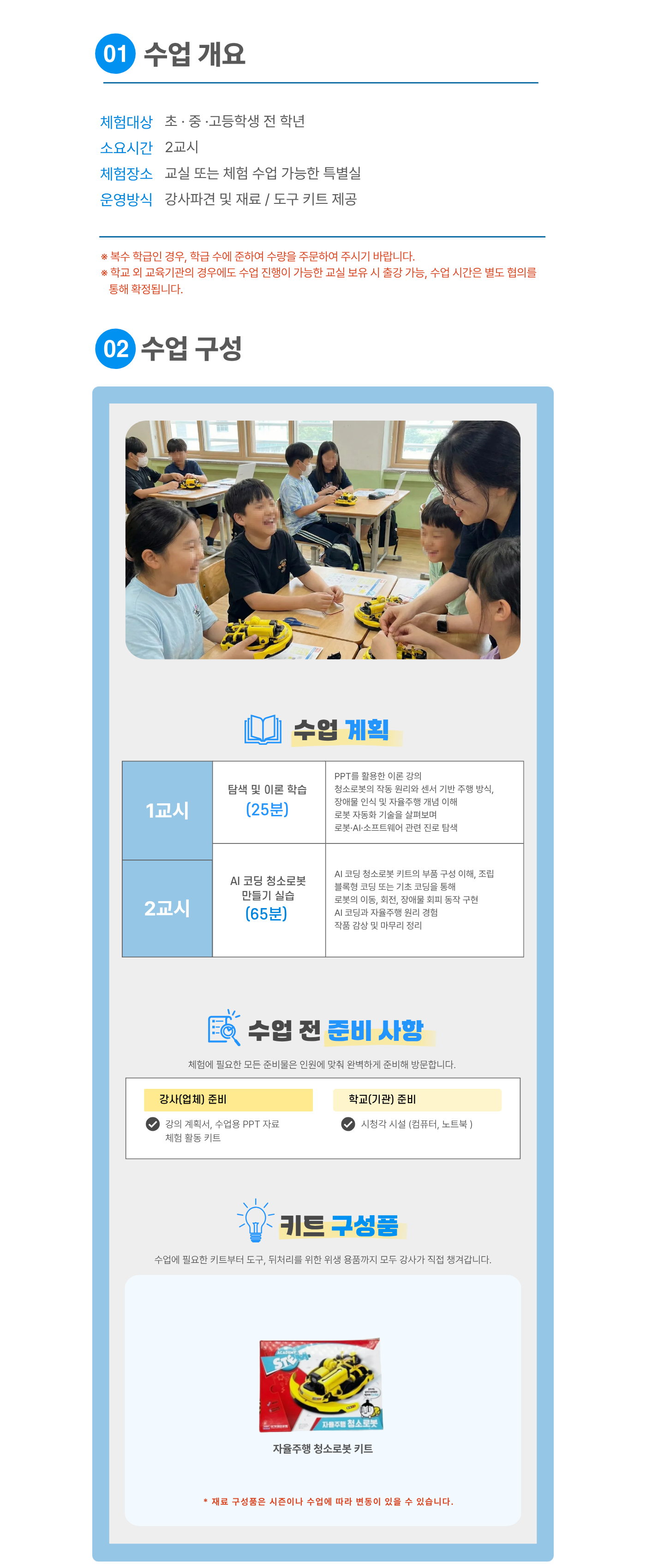 | 유의사항 | 한 과목당 최소 20명 이상 (한 반 인원이 20명 미만일 경우 추가 체험비 발생, 20명 이상일 경우 변동 없음) |