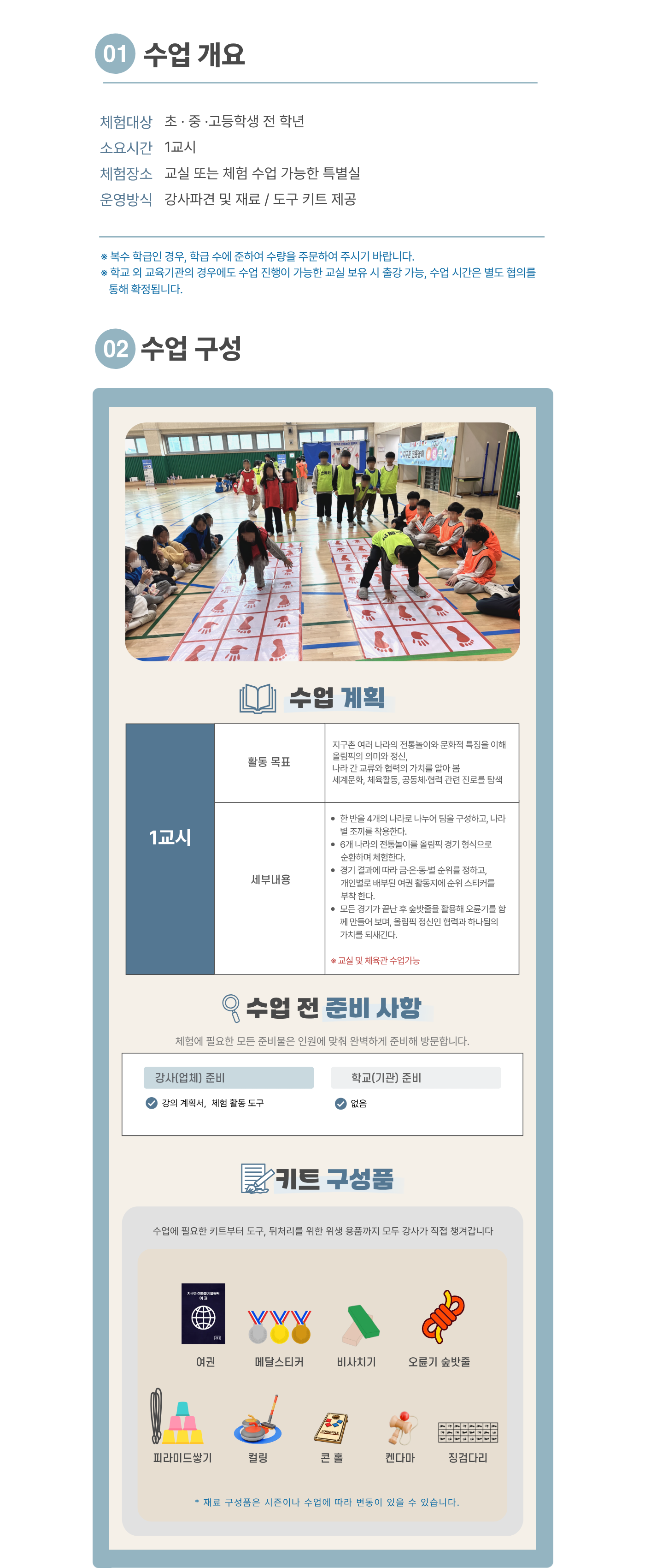 | 수업목표 | 지구촌 여러 나라의 전통놀이와 문화적 특징을 이해한다. 올림픽의 의미와 정신, 나라 간 교류와 협력의 가치를 알아본다. 세계문화, 체육활동, 공동체·협력 관련 진로를 탐색한다. |