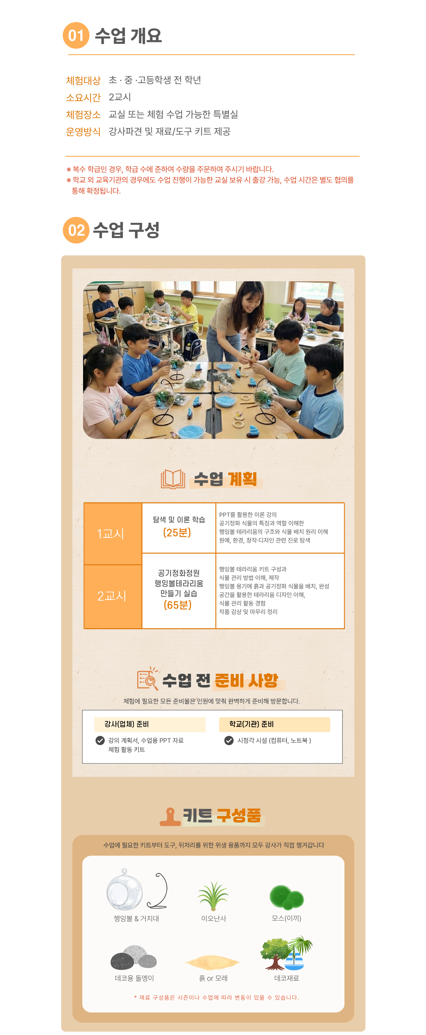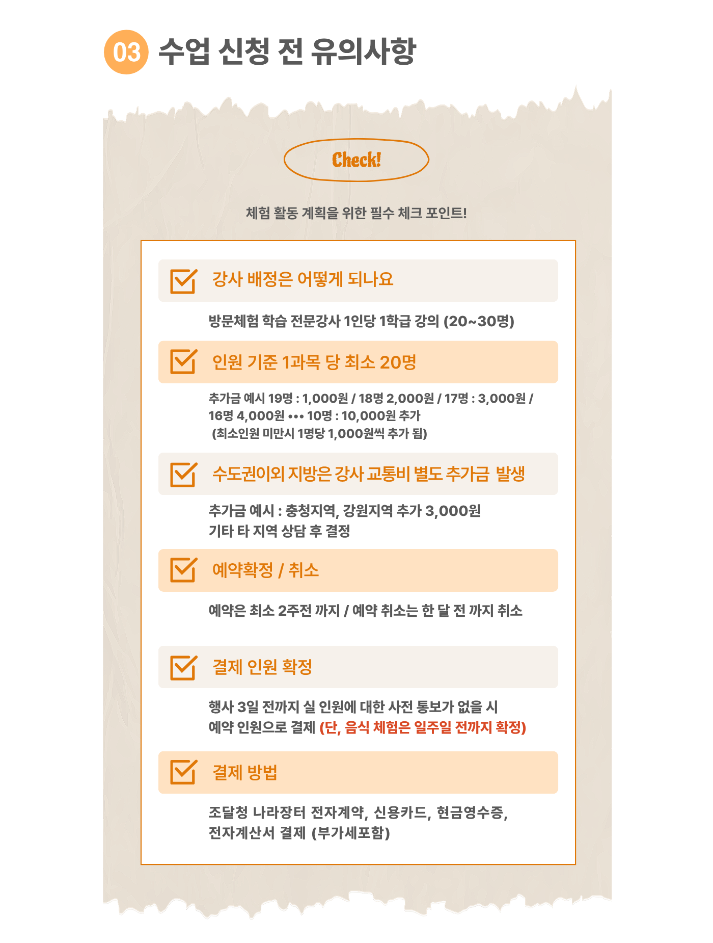 | 유의사항 | 한 과목당 최소 20명 이상 (한 반 인원이 20명 미만일 경우 추가 체험비 발생, 20명 이상일 경우 변동 없음) |