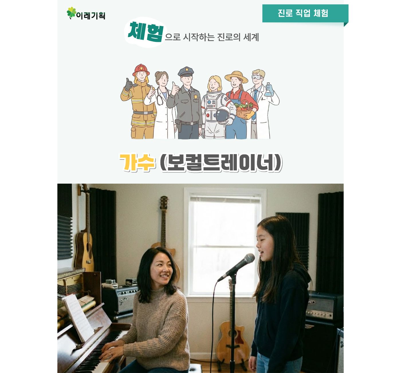 | 대상 | 전국 초/중/고 학년 교내체험학습. 전국 초등 돌봄교실 교내체험학습. 전국 중학교 자율학기제에 따른 직업체험학습. 전국 어린이집, 유치원 원내체험학습. 전국 초등학교 컵스카웃, 걸스카웃, 아람단, 해양소년단, RCY 등 청소년단체 교내체험학습. 전국 지역아동센터, 복지관, 수련관, 다문화가정센터 등의 기타단체 관내체험학습. |