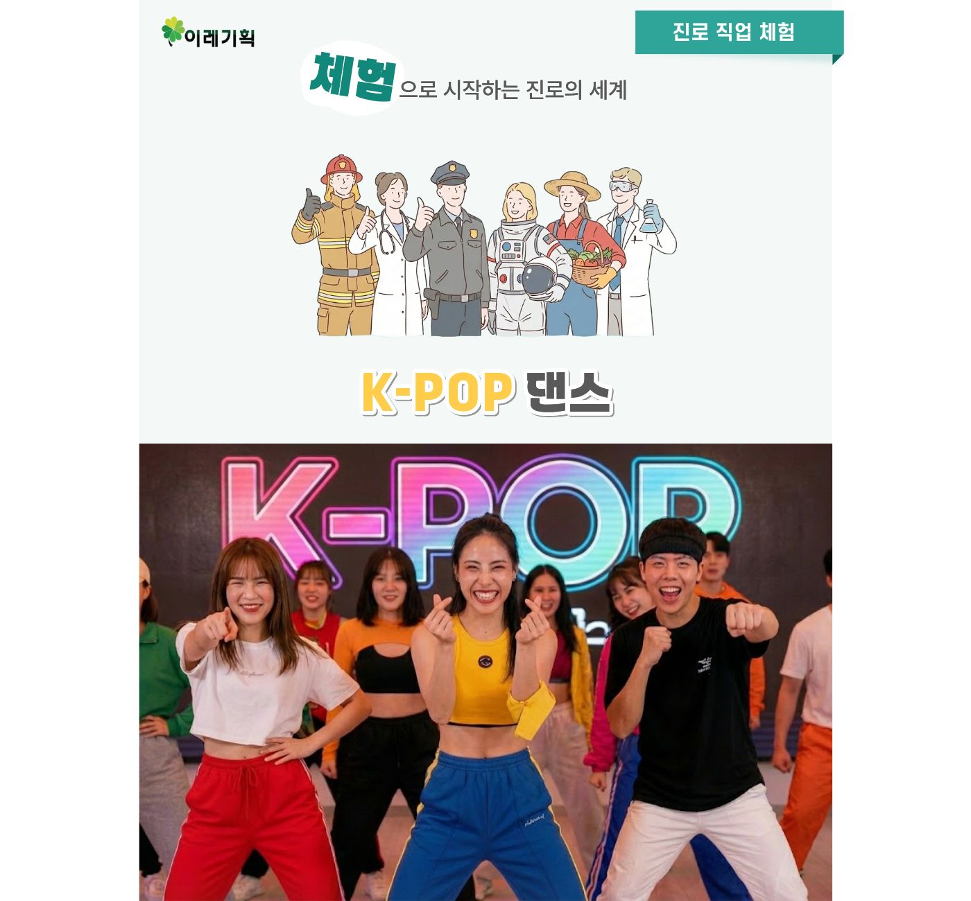 | 대상 | 전국 초/중/고 학년 교내체험학습. 전국 초등 돌봄교실 교내체험학습. 전국 중학교 자율학기제에 따른 직업체험학습. 전국 어린이집, 유치원 원내체험학습. 전국 초등학교 컵스카웃, 걸스카웃, 아람단, 해양소년단, RCY 등 청소년단체 교내체험학습. 전국 지역아동센터, 복지관, 수련관, 다문화가정센터 등의 기타단체 관내체험학습. |