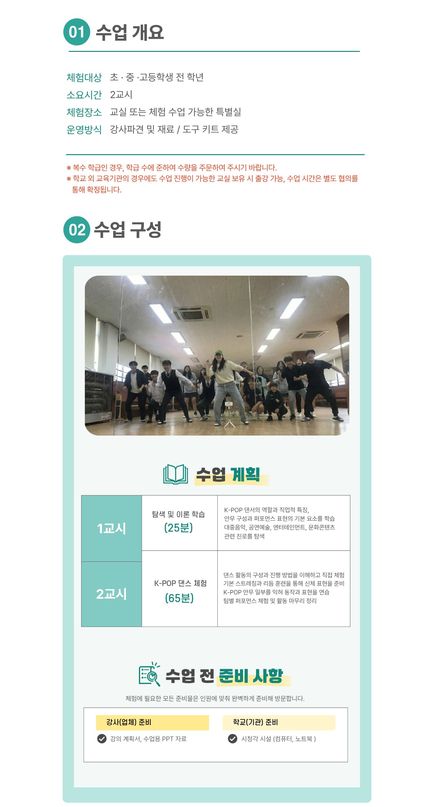 | 인원기준 | 1과목당 최소 21명 이상 (1반 인원이 21명 미만일 경우 추가 체험비 발생, 21명 이상일 시 변동없음) |