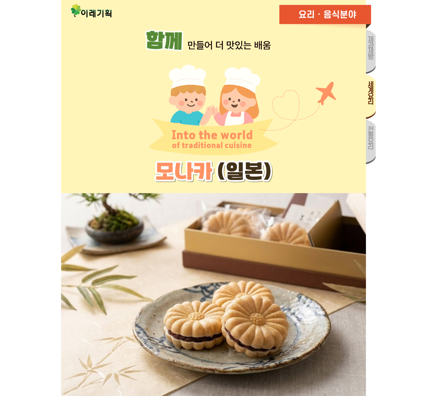 | 수업목표 | 각 나라 별 대표 음식에는 무엇이 있는지, 일본 대표 음식인 모나카의 유래와 역사에 대해 알아보고 팥 앙금와 견과류를 이용하여 소를 만들어 모나카 만들기 |