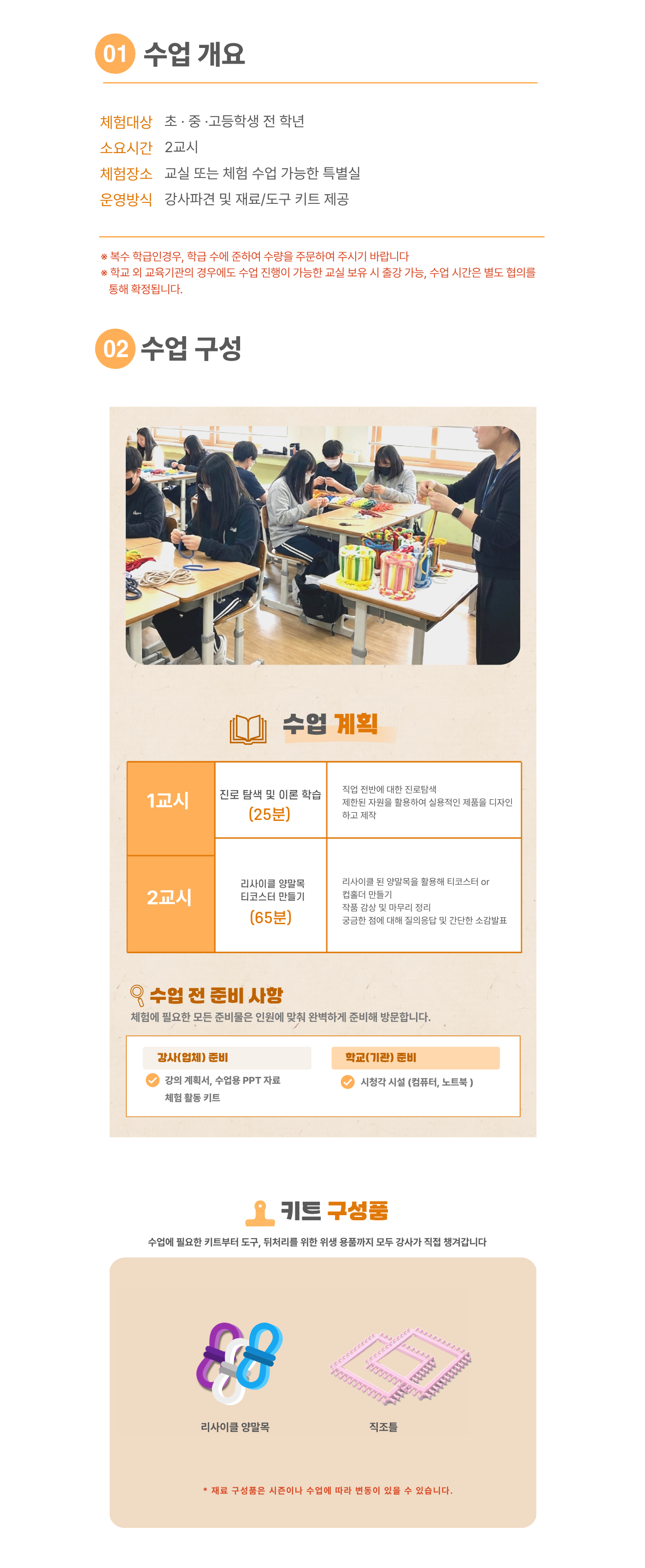 | 유의사항 | 1과목당 최소 20명 이상 (1반 인원이 20명 미만일 경우 추가 체험비 발생, 20명 이상일 시 변동없음) |