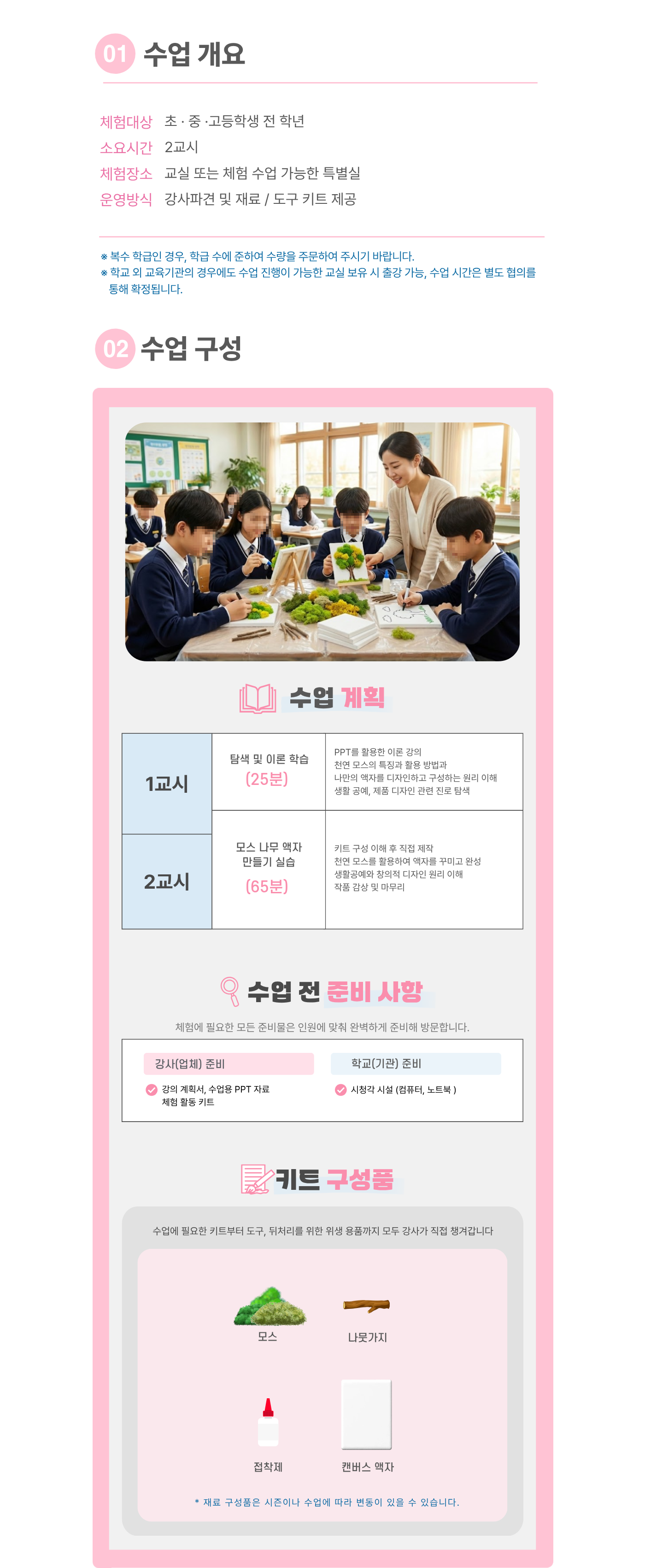 한 과목당 최소 20명 이상 (한 반 인원이 20명 미만일 경우 추가 체험비 발생, 20명 이상일 경우 변동 없음)