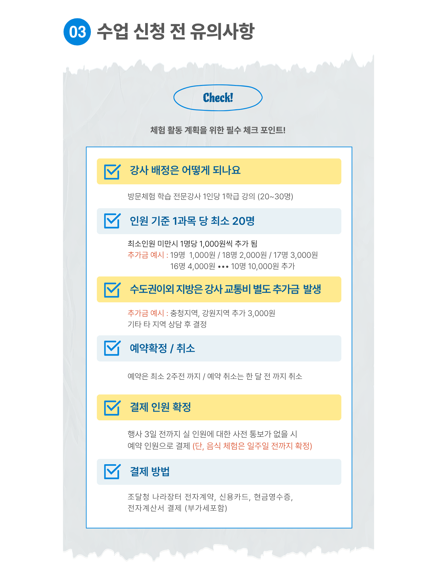 | 인원기준 | 1과목당 최소 21명 이상 (1반 인원이 21명 미만일 경우 추가 체험비 발생, 21명 이상일 시 변동없음) |