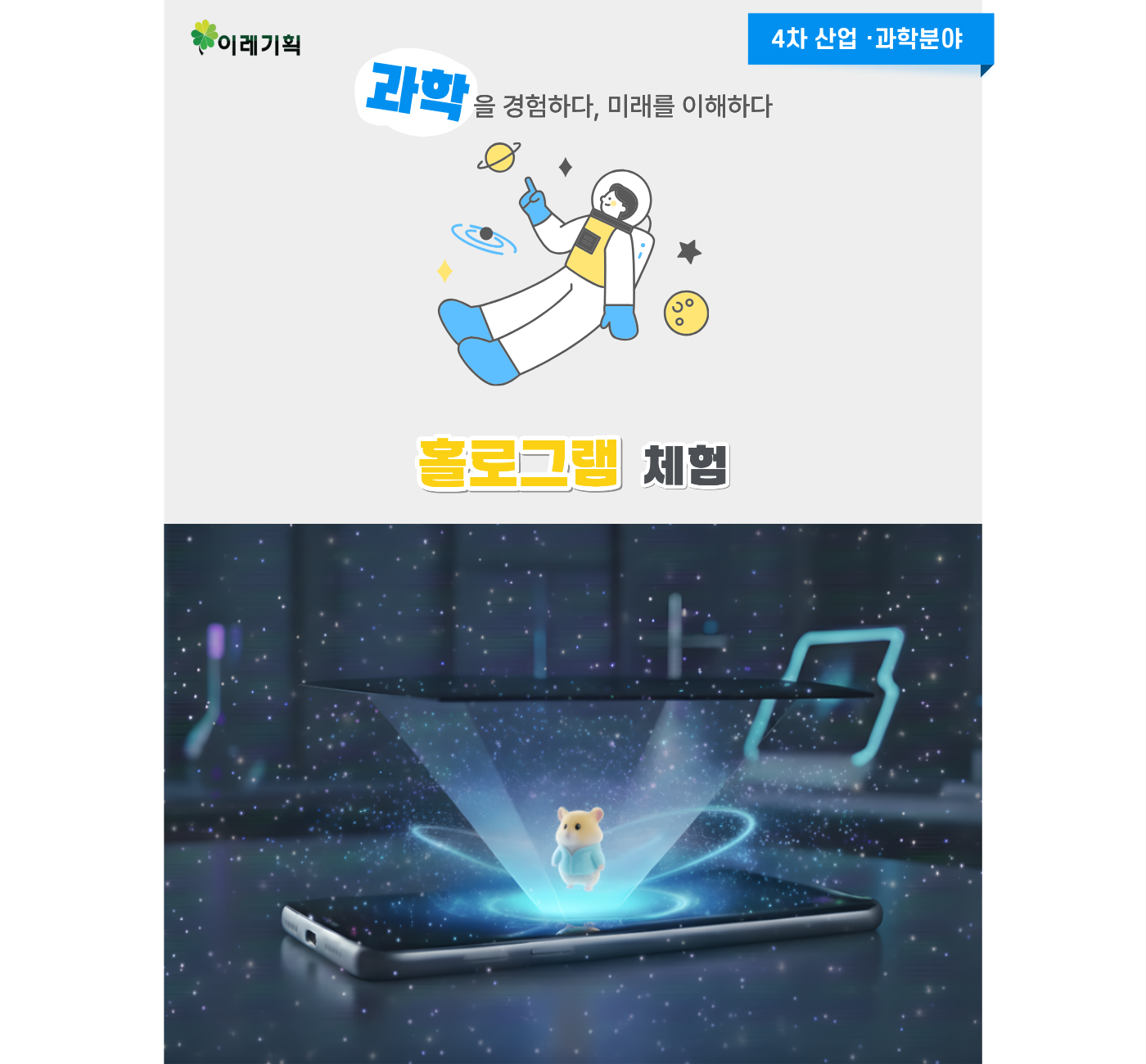 | 수업목표 | 홀로그램의 유래와 어디에 사용되는지 알아보고 홀로그램 키트를 만든 다음 핸드폰으로 홀로그램 영상을 촬영하여 키트로 시청하기 |