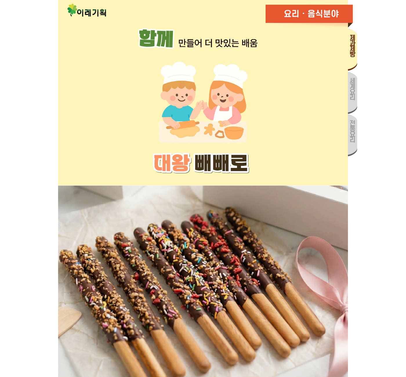| 수업목표 | 쇼콜라티에에 대해 알아보고 여러가지 토핑 재료를 이용하여 나만의 빼빼로 만들기 |