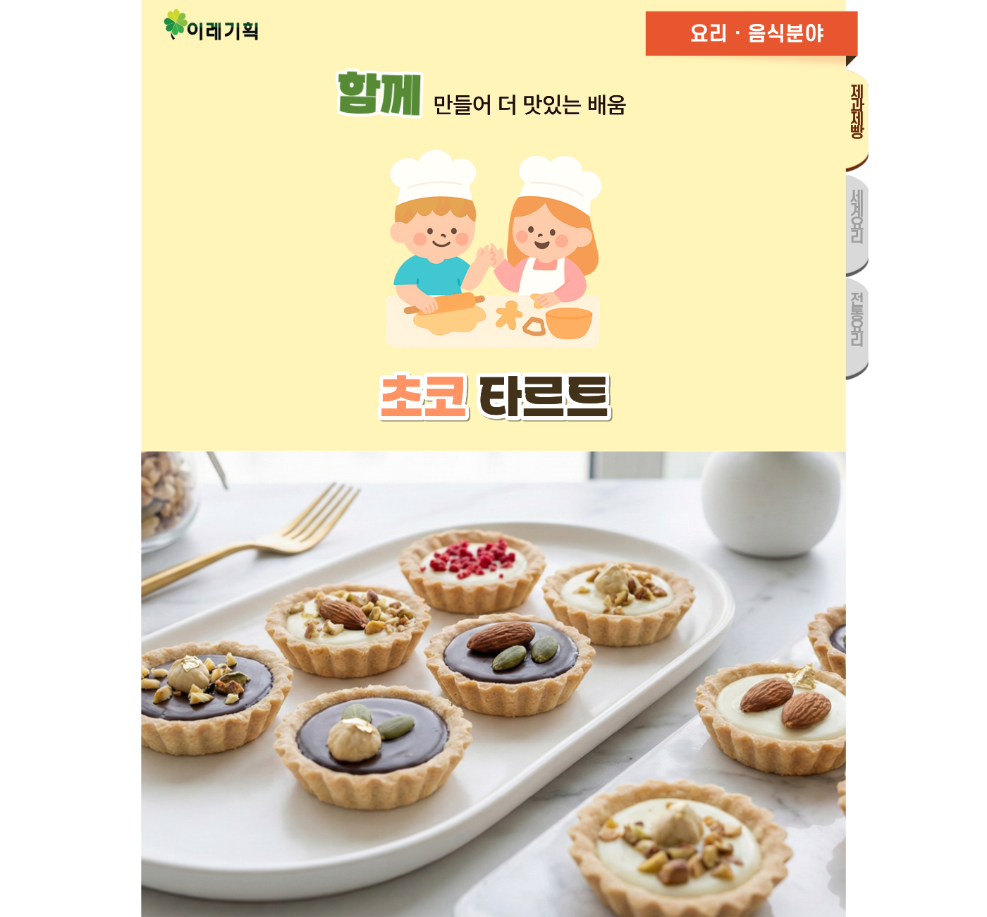 | 수업목표 | 파티시에에 대해 알아보고, 여러가지 토핑 재료를 이용하여 나만의 초코 타르트 만들기 |