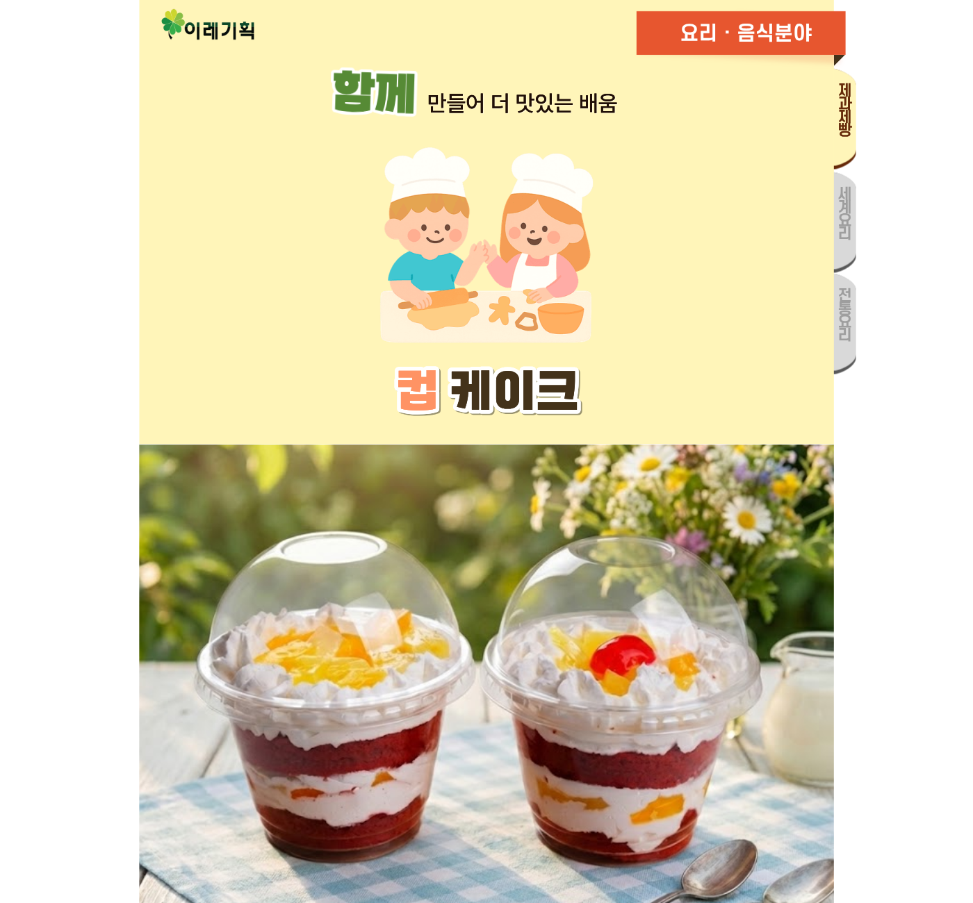 | 수업목표 | 파티시에에 대해 알아보고, 생크림과 토핑 재료를 이용하여 나만의 컵 케이크 만들기 |