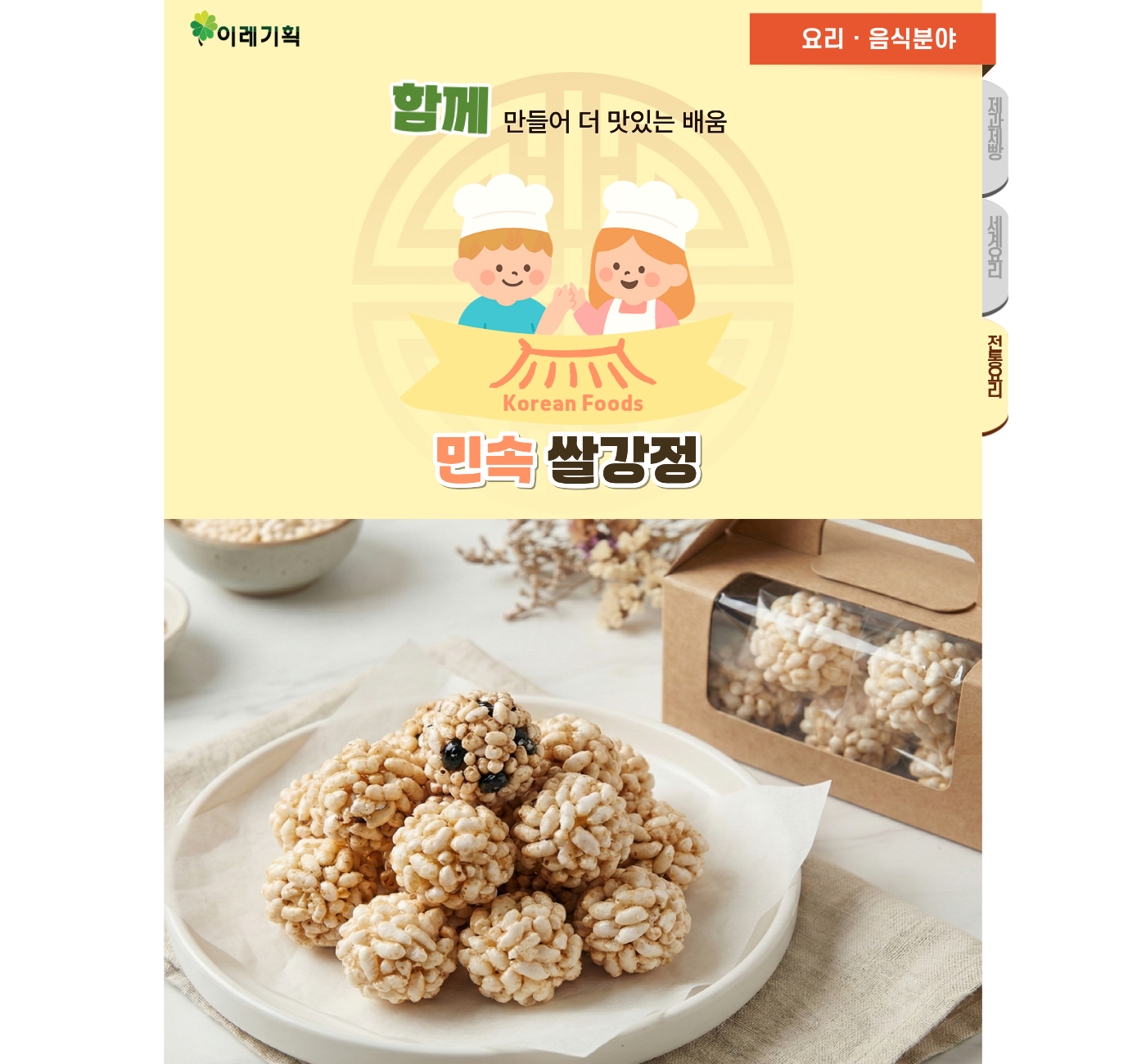 | 수업목표 | 우리 나라 전통음식인 쌀강정의 유래와 역사에 대해 이해하고, 튀밥에 물엿과 설탕을 넣어 나만의 쌀강정 만들기 |