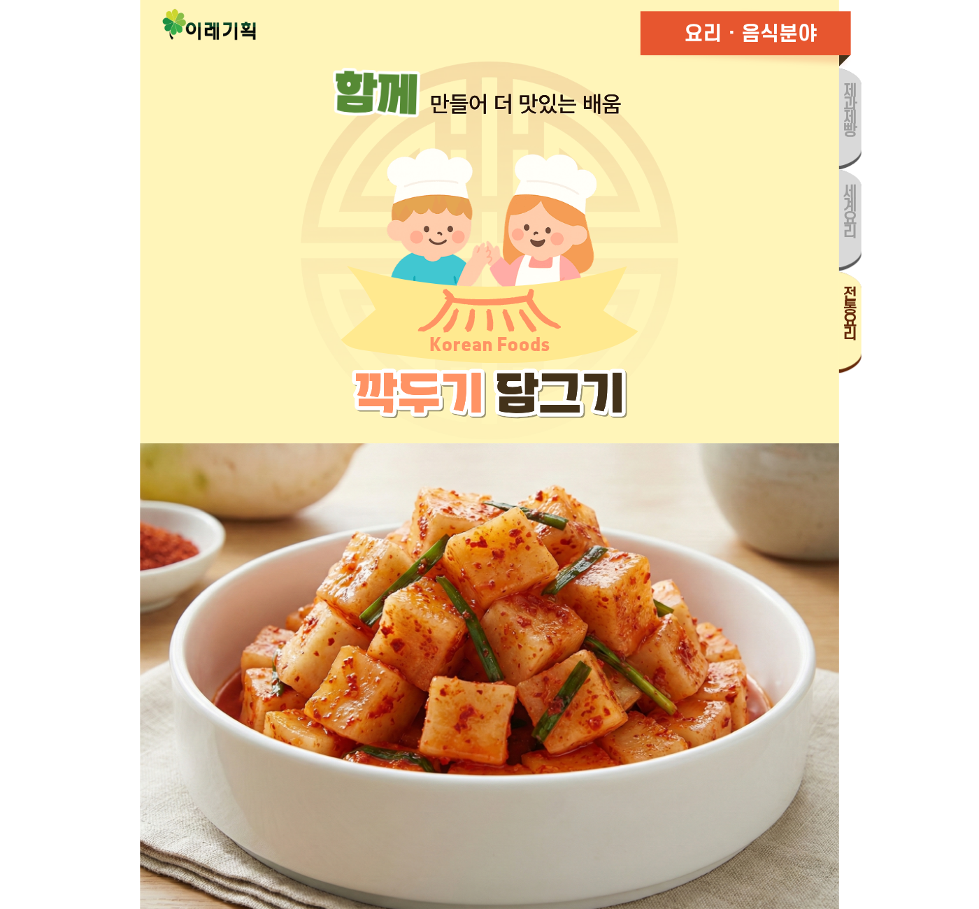 | 수업목표 | 우리나라 전통 음식에 대해 알아보고, 깍두기 담그기 |