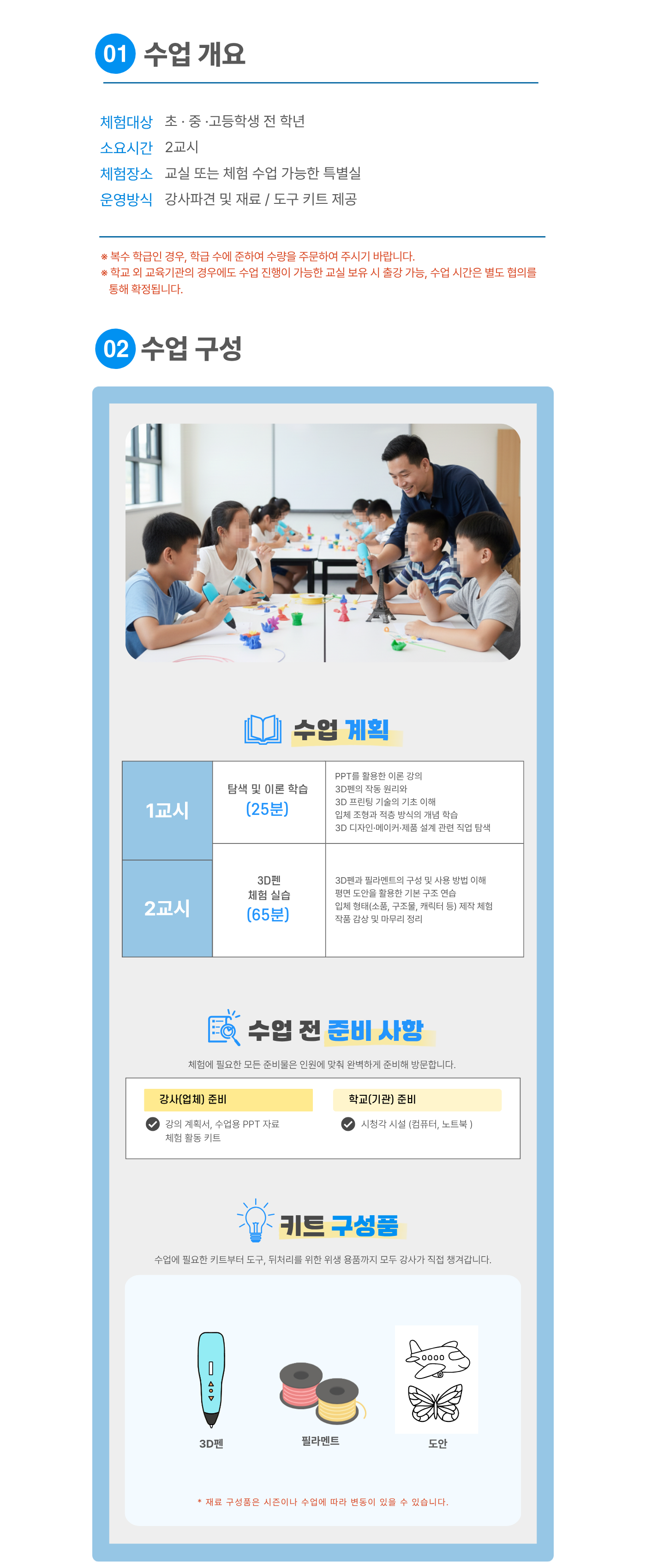 | 유의사항 | 한 과목당 최소 20명 이상 (한 반 인원이 20명 미만일 경우 추가 체험비 발생, 20명 이상일 경우 변동 없음) |
