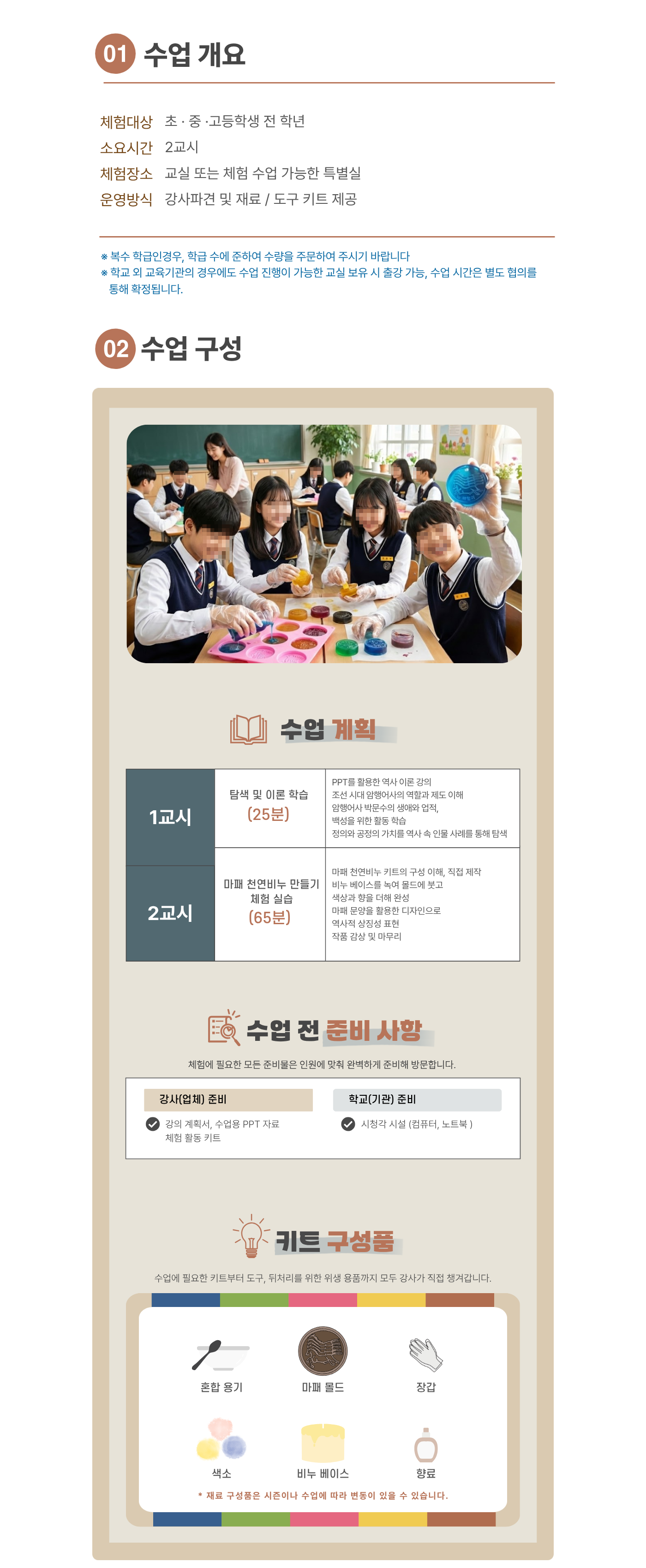 | 유의사항 | 한 과목당 최소 20명 이상 (한 반 인원이 20명 미만일 경우 추가 체험비 발생, 20명 이상일 경우 변동 없음) |