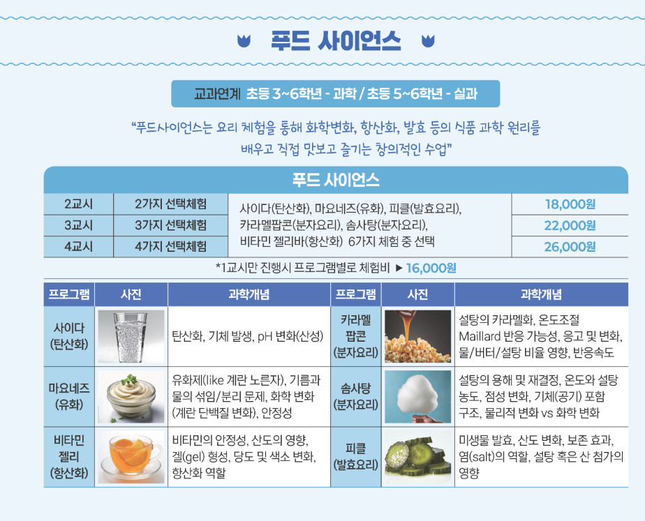 | 체험시간 | 2교시(18,000원) / 3교시(22,000원) / 4교시(26,000원) |