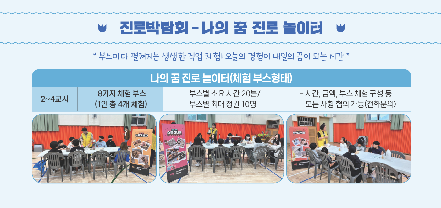 | 체험시간 | 2~4교시 : 8가지 체험 부스 (1인 총 4개 체험) 부스 별 소요 시간 각 20분/ 부스 별 최대 정원 10명 (모든 사항 협의 가능: 전화 문의) |