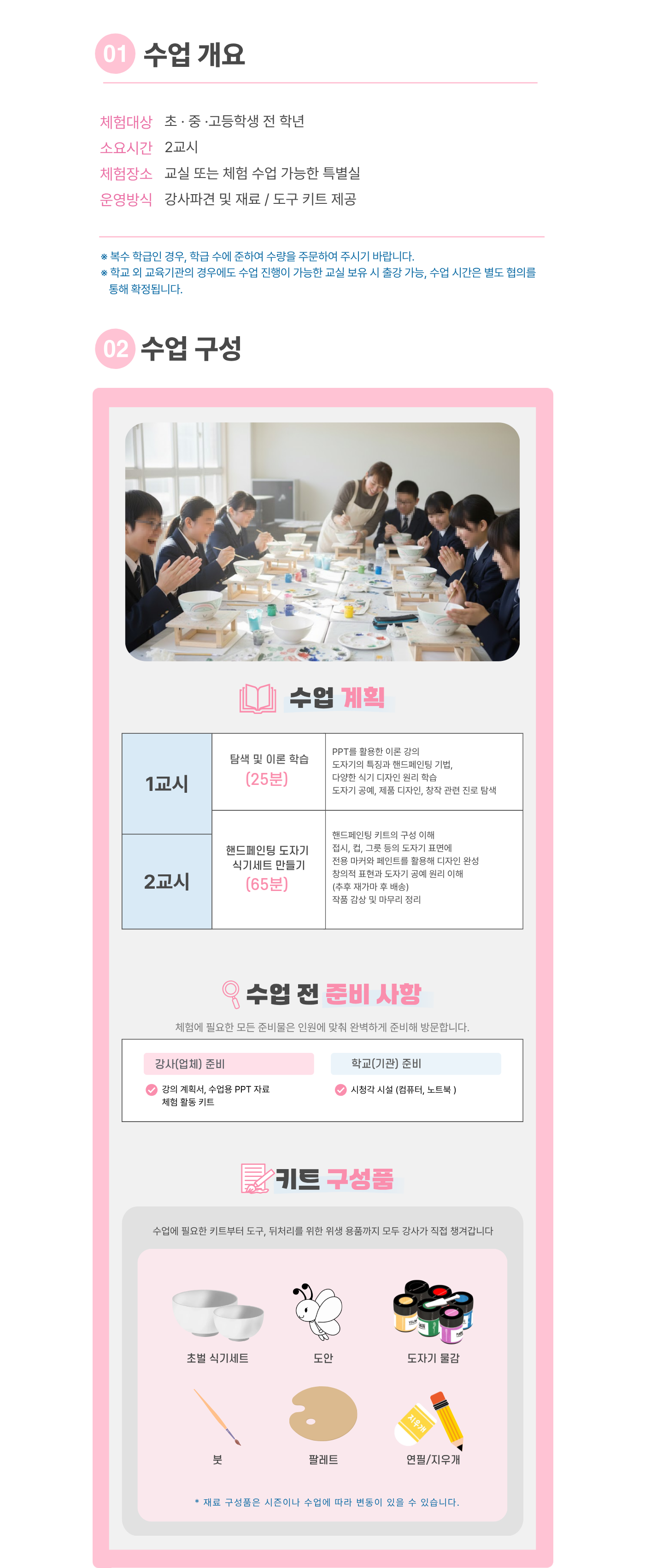 | 인원기준 | 1과목당 최소 21명 이상 (1반 인원이 21명 미만일 경우 추가 체험비 발생, 21명 이상일 시 변동없음) |