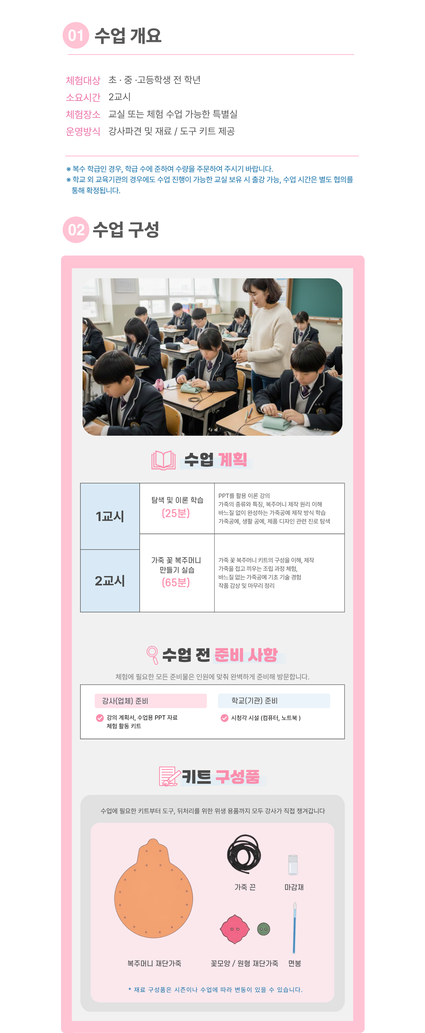 한 과목당 최소 20명 이상 (한 반 인원이 20명 미만일 경우 추가 체험비 발생, 20명 이상일 경우 변동 없음)