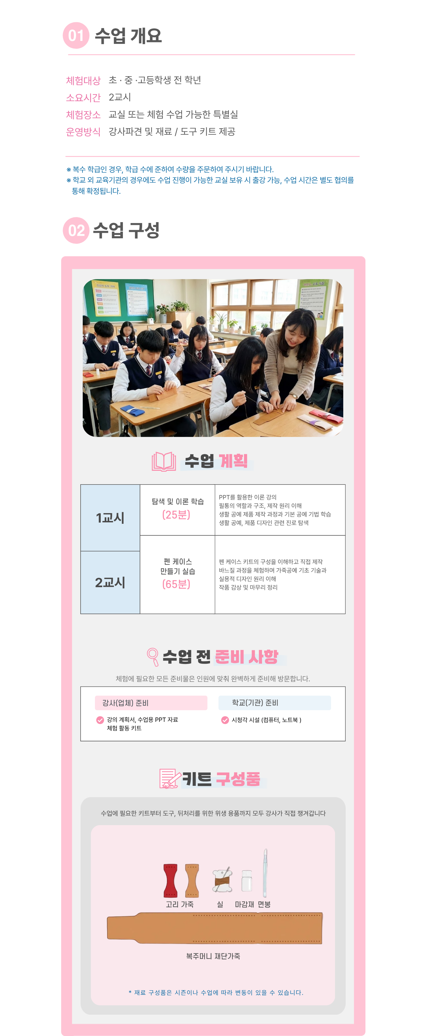 한 과목당 최소 20명 이상 (한 반 인원이 20명 미만일 경우 추가 체험비 발생, 20명 이상일 경우 변동 없음)