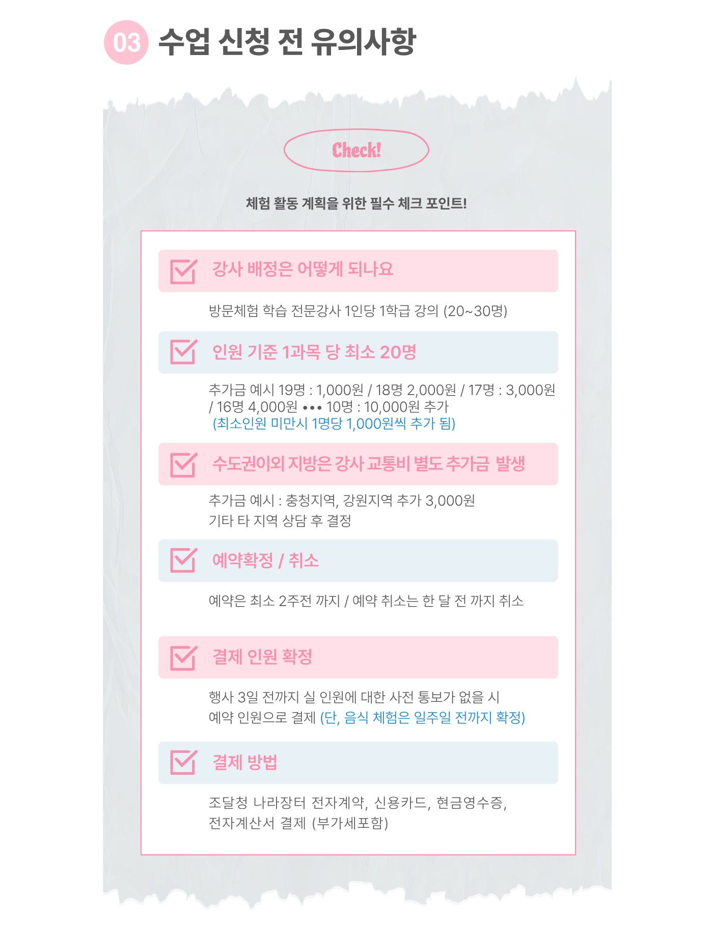 | 유의사항 | 한 과목당 최소 20명 이상 (한 반 인원이 20명 미만일 경우 추가 체험비 발생, 20명 이상일 경우 변동 없음) |