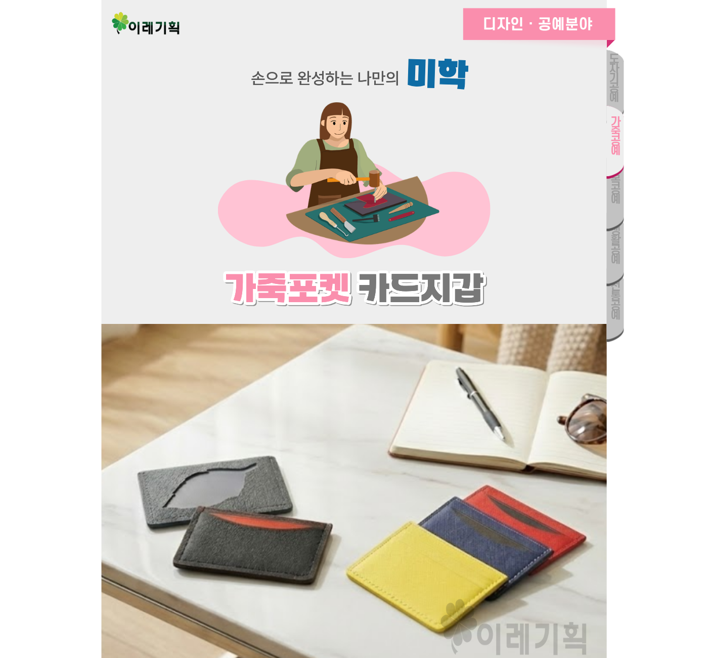 | 수업목표 | 가죽공예를 알아보고, 가죽포켓카드지갑 만들기 |