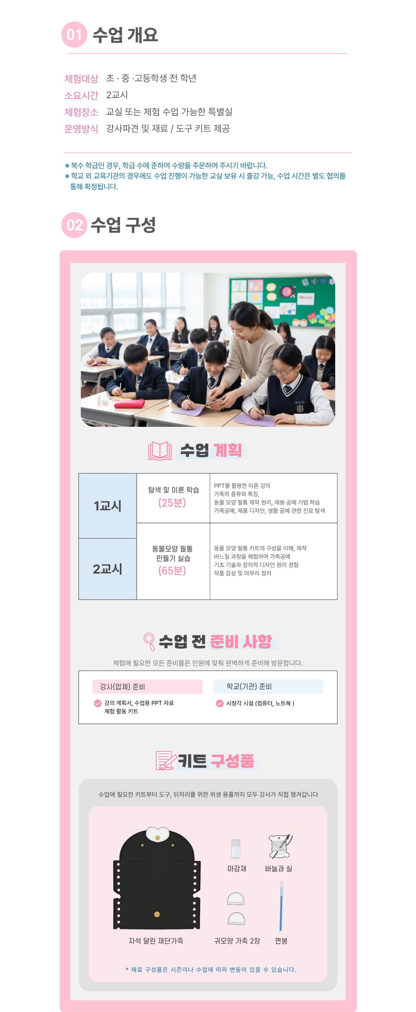 | 유의사항 | 한 과목당 최소 20명 이상 (한 반 인원이 20명 미만일 경우 추가 체험비 발생, 20명 이상일 경우 변동 없음) |