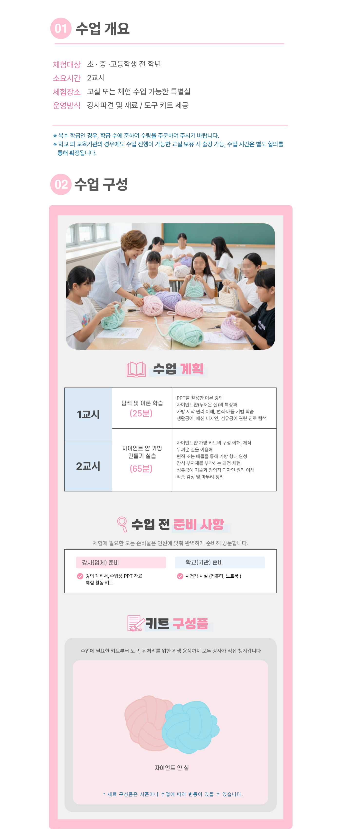 | 유의사항 | 한 과목당 최소 20명 이상 (한 반 인원이 20명 미만일 경우 추가 체험비 발생, 20명 이상일 경우 변동 없음) |