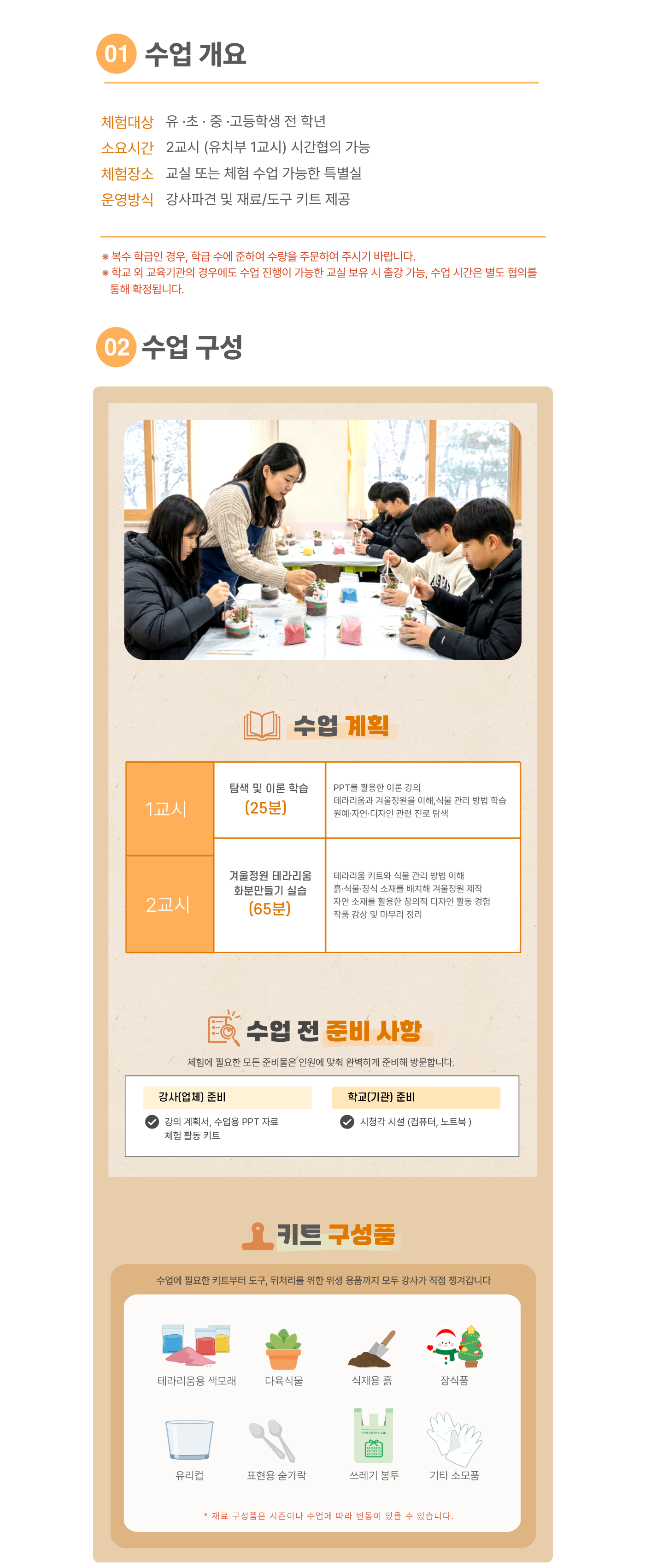 | 수업목표 | 테라리움 생태 원리를 이해하고, 테라리움 겨울정원 만들기 |