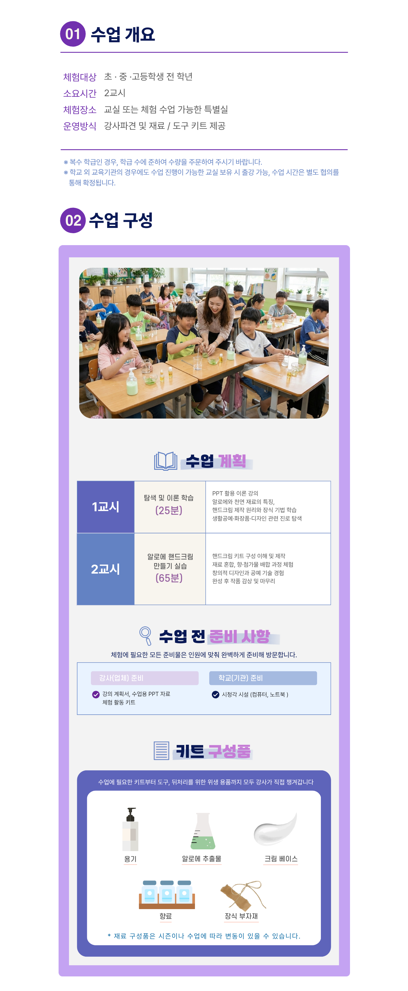 | 수업목표 | 화학 공학자(화장품 부문)에 대해 알아보고, 알로에 핸드크림 만들기 |