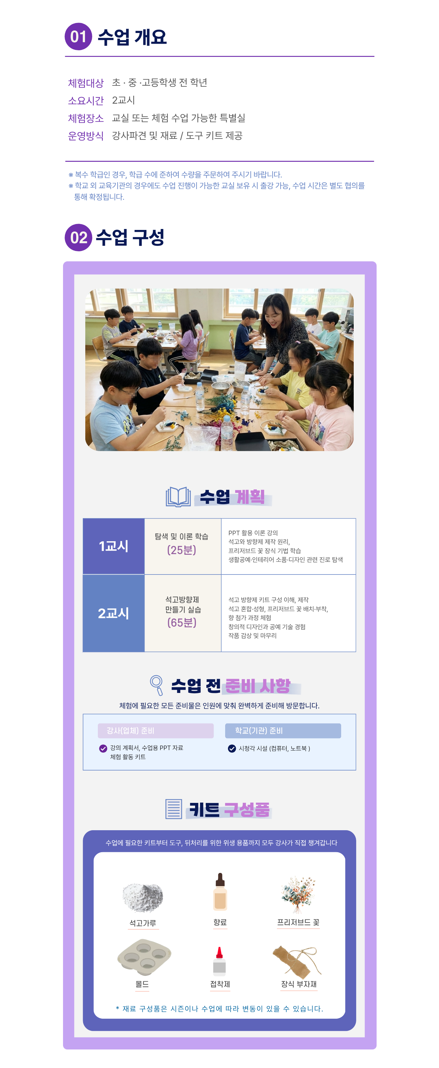 | 수업목표 | 조향사라는 직업에 대해 알아보고, 프리저브드 플라워를 이용해 석고 방향제 만들기 |