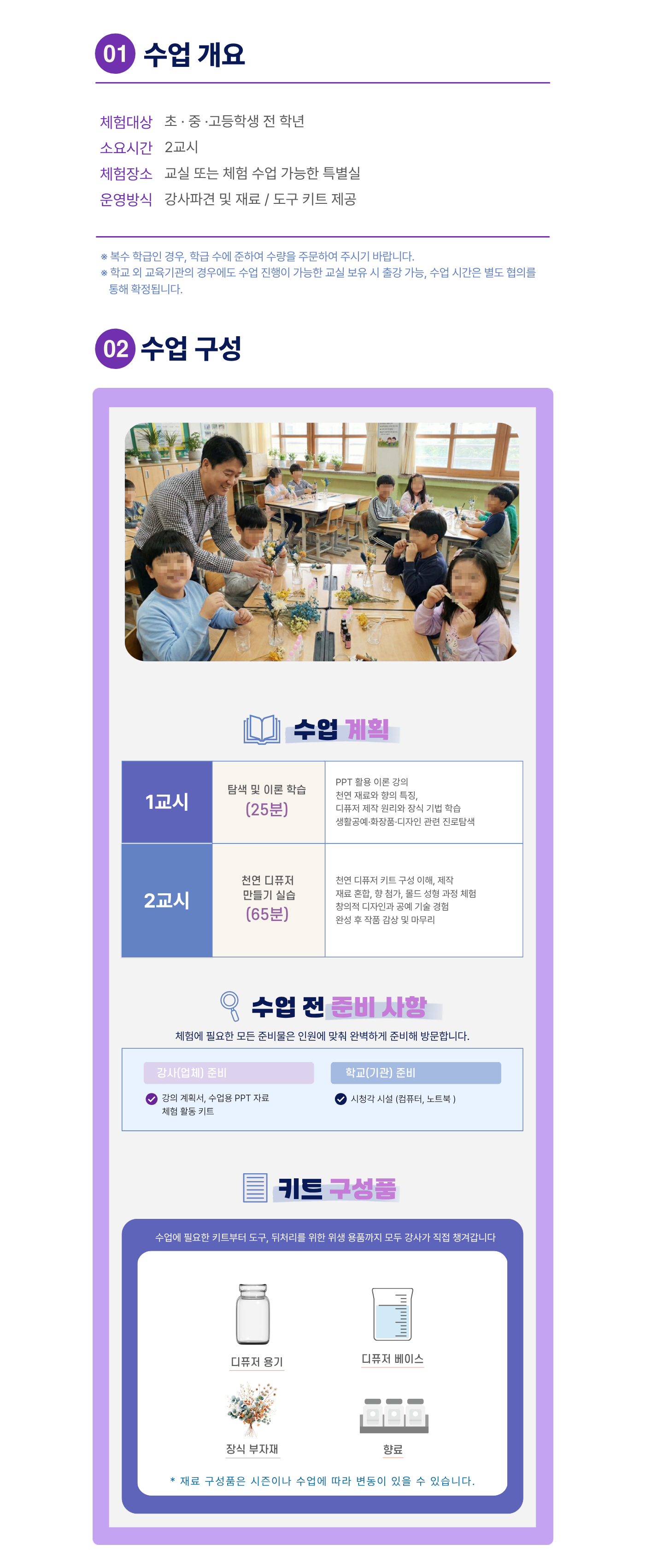 | 수업목표 | 조향사라는 직업에 대해 알아보고, 천연디퓨져 만들기 |