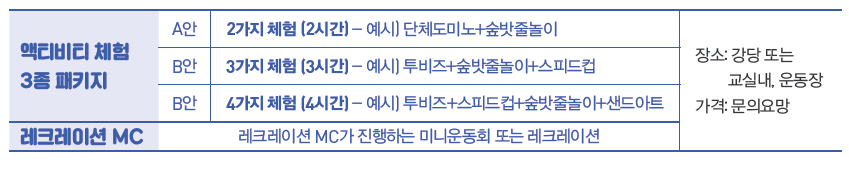 | 인원기준 | 1과목당 최소 21명 이상 (1반 인원이 21명 미만일 경우 추가 체험비 발생, 21명 이상일 시 변동없음) |